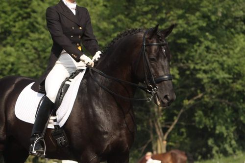 Kovington *Ps* - a 16.2 Black Stallion by Enrico Caruso *Pg*E* out of Karline by Schwalbenherbst - is one of the last approved sons sired by Enrico Caruso and descends from Count Dohna’s famous K-family from East Prussia. Recent members of this family include Neumuenster approval champions King Arthur and Kennedy. The family consistently produces correct and durable horses with laid-back temperaments and powerful movements. He was approved by the ATA in 2003, Kovington has been trained as a dressage horse with great success at Young Horse FEI classes and championships in Devon.